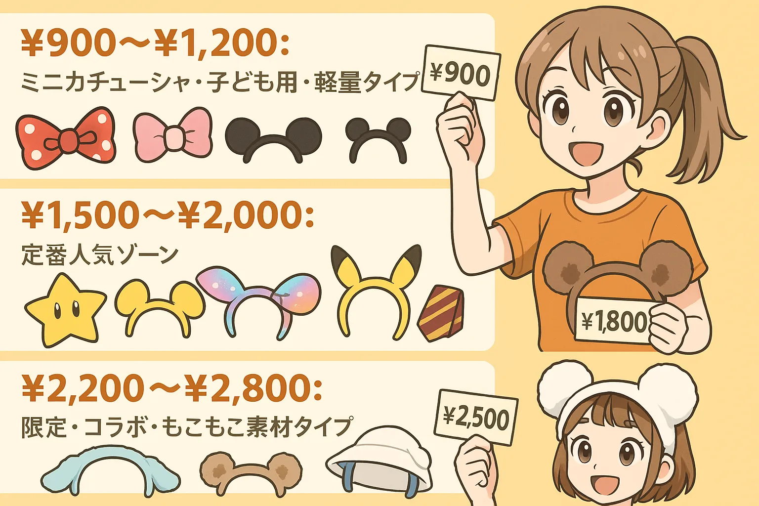 - ¥900〜¥1,200: ミニカチューシャ・子ども用・軽量タイプ。
